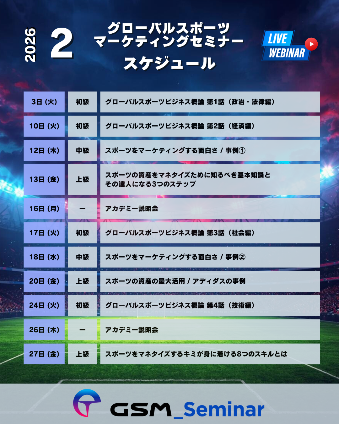 2026年2月度のスポーツビジネスセミナーの案内です。